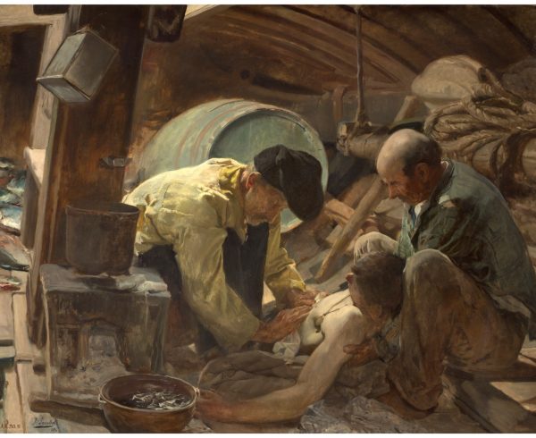 El cuadro representa un grupo de operarios trabajando en el pulido de un suelo de parqué dentro de lo que aparenta ser un típico apartamento haussmaniano.